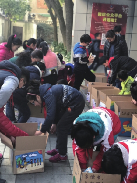 再来看看平直实验小学的娃娃们。今年,学校再次开展“衣加衣学雷锋,书香浸润童年爱心捐书”行动,共捐书籍超过40大箱,1700余本,书籍由义工组织转送到云南。有意思的是,与往年不同,这次放书的纸箱由孩子们亲手绘制。有的班级,画上了栩栩如生的读书图;有的班级,写上了一句句关于读书的名言警句;有的班级,贴上了一张张精致典雅的爱心书签;有的班级,写上了同学们对远方小伙伴亲切的问候……里面的书籍是礼物,外面的纸箱也是别具一格呢!