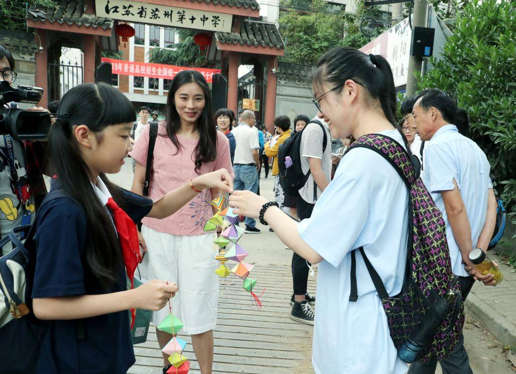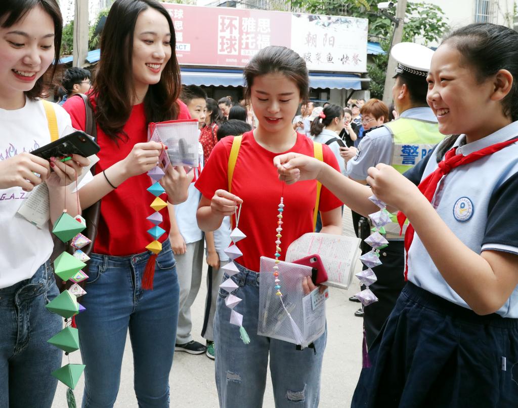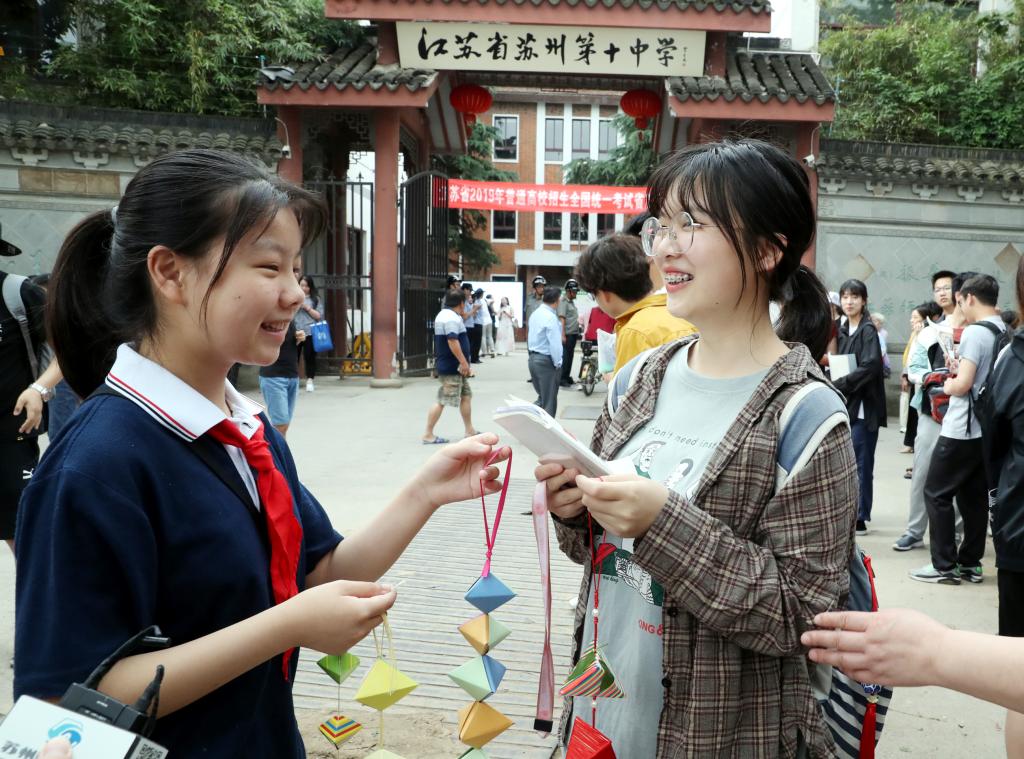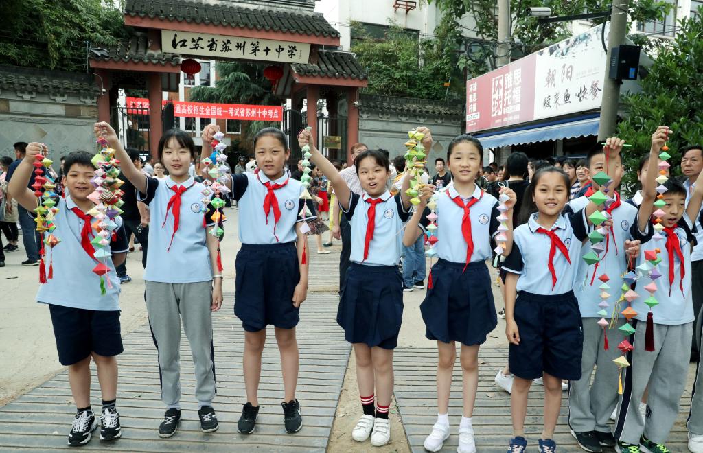 今天(6月7日)是端午节,又逢高考第一天,万彩网100线路的1550名小学生亲手制作了一串串漂亮的彩色纸粽子,来到考场外送给参加高考的考生们,祝福学哥学姐们“高中”。