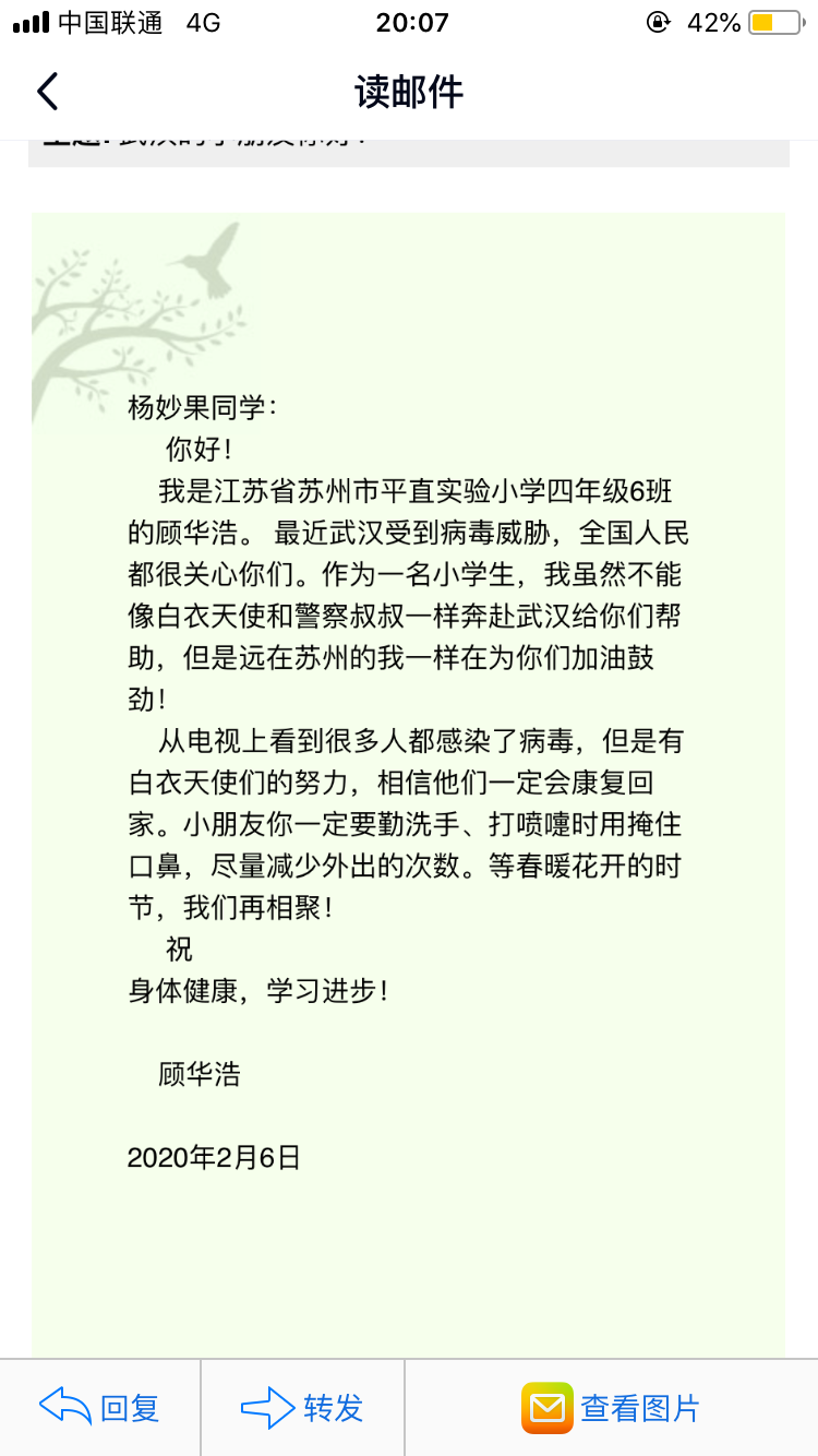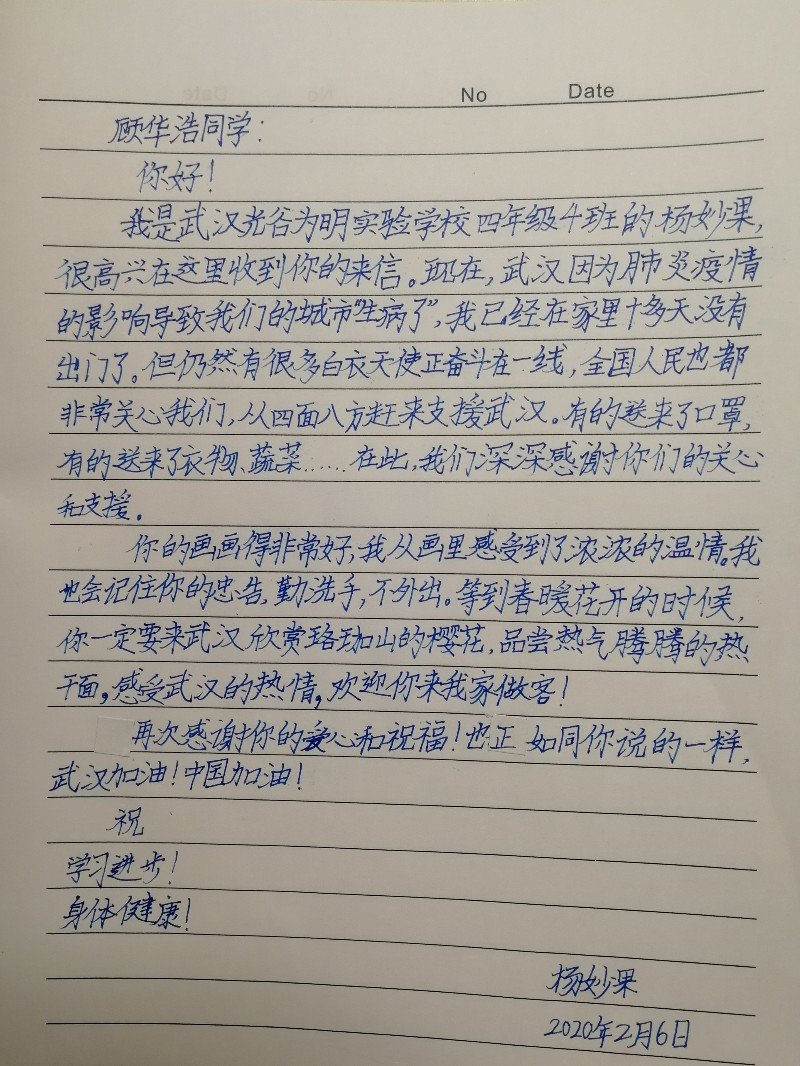 奥运体操冠军杨威、杨雪等人于2020年1月29日发起的“一封画信为你加油”活动发起至今,苏州、无锡、张家港、太仓、泗洪等区域共有22所学校约四万名学生参与其中。截止到2020年2月6日18点,活动已收到长三角同学们的画信作品约5800幅,其中大部分的作品已通过电子邮件方式传递给武汉的同学们。武汉的同学也用各种不同方式回复给长三角地区的同学,感谢他们的爱心传递,二地同学们真挚的情谊在疫情依然严峻的情况下更显温暖人心。目前,苏州市平直实验小学4-6年级的749名孩子们与武汉光谷为明实验学校4-6年级的405名孩子结成抗“疫”小伙伴,用心描绘祝福,给武汉光谷为明实验学校的同学们送去了最温暖的祝福与鼓励。