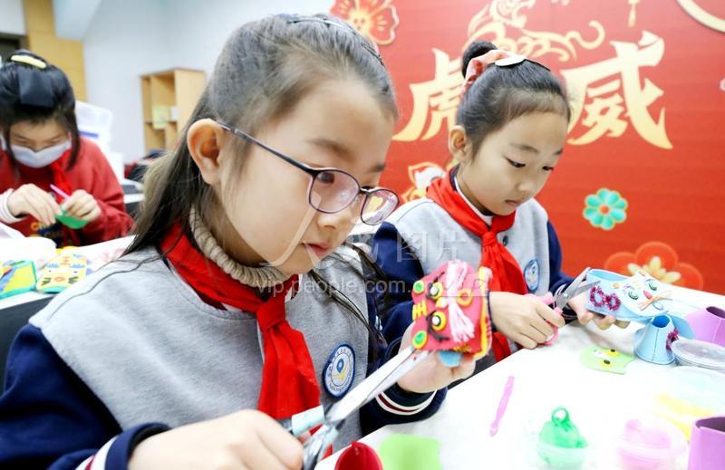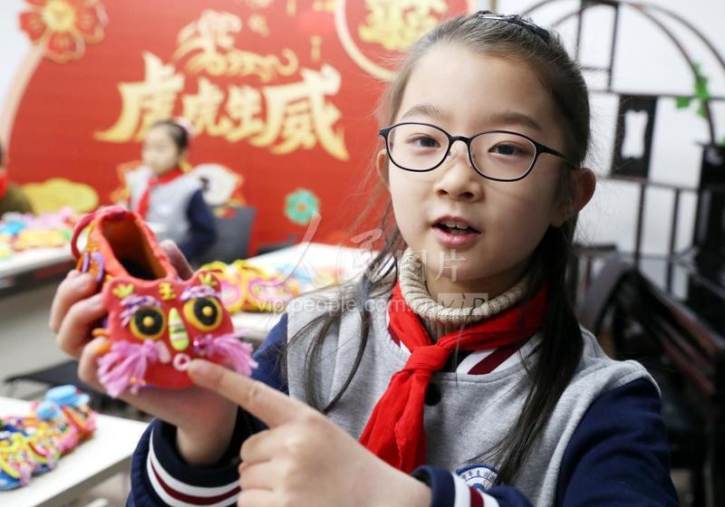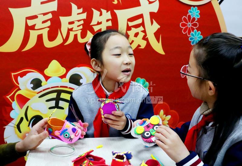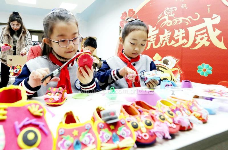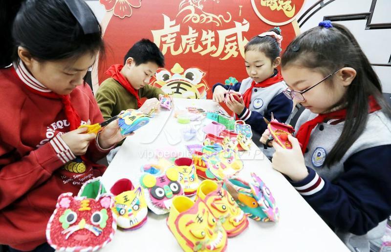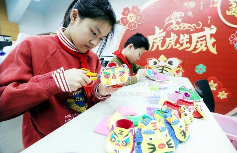 江苏省万彩网100线路的学生们在做虎头鞋。该校近300名外地学生响应当地政府倡议,留在苏州过年。假期里,学校组织这些学生们用彩色粘土制作虎头鞋,传递新年的祝福。