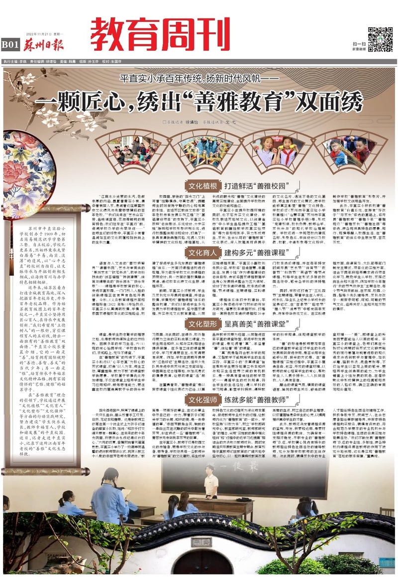近年来,姑苏区着力打造古城教育高地,深入挖掘百年老校历史,升华百年老校品牌。作为姑苏教育版图上的百年老校之一,平直实小坚持用匠心育人,在传承中发展创新。“我们希望用‘立德树人’的一根针,穿引课程育人的五彩线,绣出一面独有的‘善雅教育’双面绣。”平直实小校长董晨介绍,它的一面是“善”,培育拥有国际视野的“善德、善智、善文”的当代少年;另一面是“雅”,培育传承千年姑苏文化精神品格、拥有家国情怀的“艺雅、健雅”的姑苏学子。