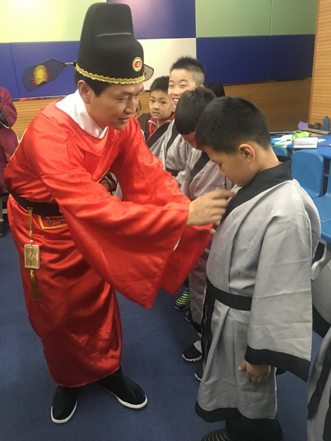 同学们先正衣冠,准备仪式开始。万里先生邀请了四位同学,请王润城谷主用朱砂在他们的额头为他们点上两点,寓意开启“智慧之眼”。由这四位同学代表大家敬献上祭祀贡品。谷主宣读祭仓颉文。宣读完毕将祭文放置于祭台,由乐活仙谷的守护神兽大来守护。接下来谷主带领大家诵读了《礼运大同篇》和《乐活仙谷赞》。同学们用朗朗的诵读声表达着对先贤的敬重。祭完先贤,我们还要记得感恩。感谢老师教会了我们知识和道理;感谢父母给予生命和陪伴成长。几名同学代表向父母和老师敬茶,感谢他们的付出。