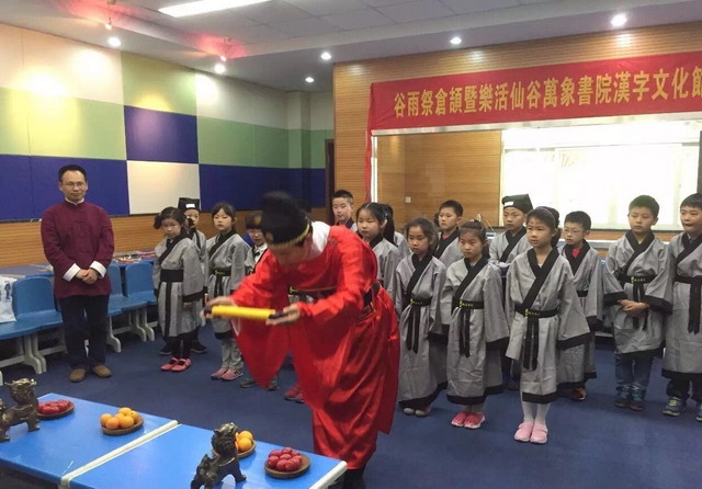 2017年谷雨前一天,平直实验小学内一节特殊的国学课正在平直学堂徐徐拉开序幕。学校邀请了万象书院的几位老师,带领同学们一起举行了谷雨祭仓颉的活动。