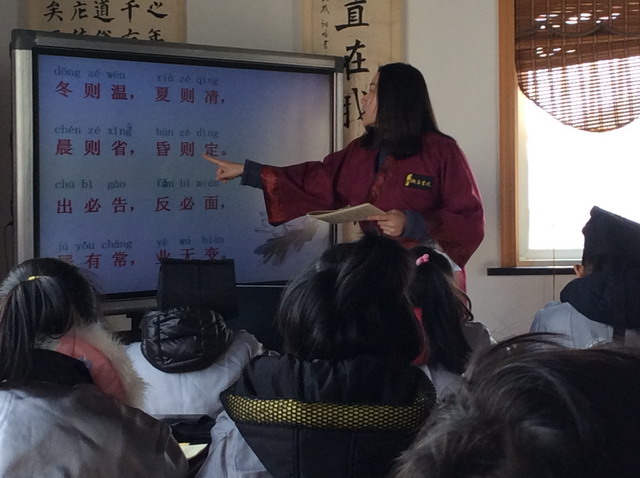 简短的开班仪式后,第一节课开始了。沈老师以一句“百善孝为先”引出了今天的主题——孝道,并带领同学们开始诵读《弟子规》之总叙和入则孝,随着老师的节拍,同学们时而集体诵读,时而分组诵读或是分男女生诵读,一句句吟诵得都那么认真,朗读声更是铿锵有力。课堂上同学们争先恐后的举手,积极要求发言,气氛非常活跃。相信通过今天的学习他们定能学会如何孝养父母长辈。