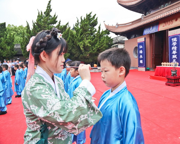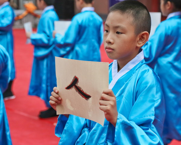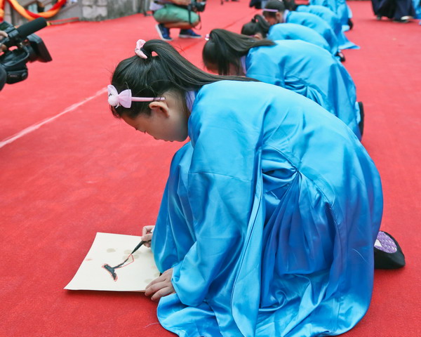 我校学生有幸参与了祭孔典礼环节中的开笔礼仪式。上午9时38分,祭孔典礼正式开始。在雄浑的鼓声中,率先进行的是还原古代启蒙学习仪式的国学学堂开笔礼,这也是开笔礼首次亮相祭孔典礼。40多名身着汉服的我校三年级学童,通过整衣冠、拜孔子像、朱砂开智、击鼓鸣志、描红“人”字、感恩鞠躬等仪式,接受传统启蒙教育,激励少年儿童立志成长。启蒙描红,让孩子在老师的指导下学好“人”字。作为一个学子漫漫求学之道的开始,选择这个笔画简单而又意义深远的汉字,是希望孩子们在人生的启蒙阶段就能学会做人。