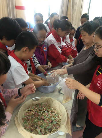 9日中午,共有20名平直实小的少先队员和红十字会成员向来自蝴蝶妈妈社区的老师们学习制作重阳糕,同学们一起动手参与制作过程,最后在糕点的点缀使得糕点更厚实起来,饱含了对爷爷奶奶浓浓的敬意。孩子们用灵巧的双手制作了具有浓重意义的重阳糕。在蒸糕的过程中,同学们拿出准备好的贺卡,写上对爷爷奶奶们想说的话。每一张贺卡都表达了同学们对爷爷奶奶的深深祝福。