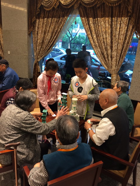 一张一张纸牌越叠越高,小小的纸牌“金字塔”孕育而生。“1、2、3、……20”,纸杯“金字塔”由20个纸杯组成,纹丝不动地立在桌子上。老人们和平直娃们一起玩着游戏,吃着点心,畅聊着曾经属于他们的六一儿童节。和孩子们一起,他们忘记了年龄,忘记了孤独,看到活泼开朗的孩子们宛如看到了曾经的自己,顿觉充满活力和朝气,满满的幸福感。