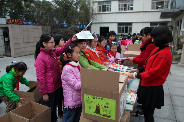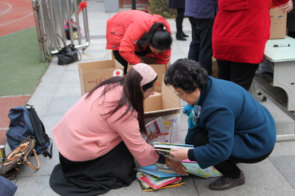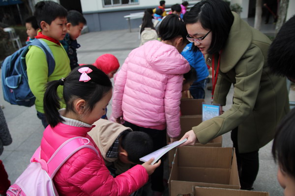 3月4日清晨,平直实验小学的学校门口热闹十分,原来是全校师生们正进行着“衣加衣学雷锋 书香浸润童年”,向云南结对学校捐书的活动,这似乎已经成为我们平直的传统与共识。早上七点半,青年志愿者服务队老师和工会教师代表就布置好桌椅,和平直义工妈妈团的家长代表们一起站在校门口,迎接一张张灿烂可爱的笑脸。慢慢的,摆好的桌子前聚满了前来捐书的孩子们,有的抱着厚厚的一叠书本,吃力地投进一只只平直孩子们精心绘制的捐书箱中,却倔强地不想爷爷搭把手;有的在桌子前徘徊了好久,最后似乎鼓起十足的勇气小心翼翼地把自己提前准备好的小书轻轻放入漂亮的书箱里,满足的背着书包走了;还有的活蹦乱跳的把书举起,好像炫耀似的交到老师们的手里,脸上的表情可自豪啦!很快,一只只满怀平直师生心意的纸箱子放满了书籍,这些箱子浸满了孩子们对远在山区学子们的爱心,变得沉甸甸·······
