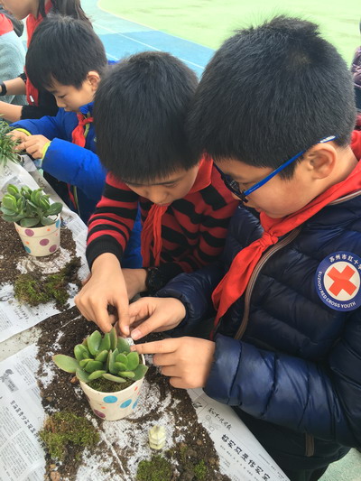 活动开始前,每人分到了一盆绿植,祁老师仔细地介绍了这些绿植的名称,特性。大家边听边观察手中的盆栽,各个都显得兴致勃勃。初步了解绿植小知识后,祁老师开始手把手的教大家移栽操作。他们跟着祁老师一步一步小心翼翼地将各种绿植移栽到新盆里,盖土,填泥,装饰,井井有条。移栽完成后,祁老师还传授了植物的养护知识,同学们拿着自己精心移栽的绿植,爱不释手。他们把盆栽拿到班级的绿化角,装点环境的同时,也为自己增添了一分责任。