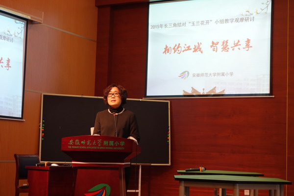 -27日,平直实验小学教师代表在徐玉英校长的带领下参加了长三角结对“玉兰花开”小组2015年线下教学研讨活动。来自江、浙、沪、皖四校同仁齐聚江城芜湖齐聚在安徽师范大学附属小学,芜湖市电教馆钱宏瑾馆长应邀出席了开幕式并发表讲话。安师大教育科学学院张新明教授、王清副教授及芜湖市三山区电教馆梁翔馆长等专家受邀参与指导。