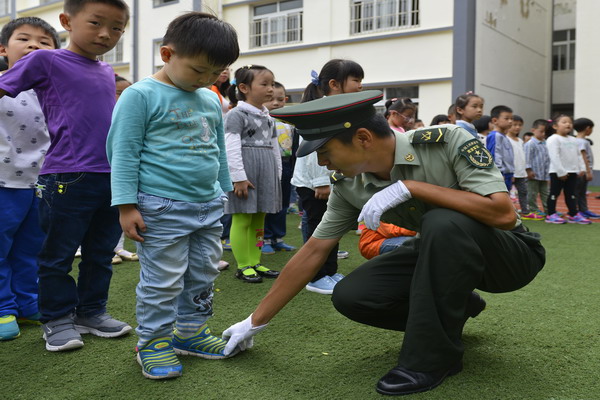 伴随着雄壮豪迈的国歌声,鲜艳的五星红旗徐徐升起。全体师生佩戴红领巾神情严肃,用最庄重的注目礼向冉冉升起的国旗致敬。仪式上,来自100医院部队的解放军们,给学生们带来了精彩的班队列演示。解放军整齐的动作,清脆响亮的口号声,让孩子们在感受他们严明纪律的同时,更多了一份对军人的崇敬与对社会的责任意识。接着孩子们也一显身手,精神百倍,雄赳赳、气昂昂地开展学做解放军的练习:立正、稍息、向前看齐等一个个动作学得像模像样,俨然就是一个个神气的小兵。活动中,来自部队的战士代表,给学生们讲述了新中国成立的故事,他简短回顾了中华民族的波澜曲折的历史进程,热情歌颂新中国成立66年来取得的巨大功绩,倡导全校师生弘扬中华民族精神,激发爱国、爱家、爱校的情感和振兴祖国的责任感。