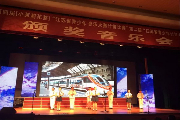 2015.8.25,从丹阳传来喜讯,我校选送的由11名同学组成的笛乐团表演的竹笛重奏《红领巾之梦》喜获由江苏省音乐家协会、丹阳市委宣传部、丹阳市文学艺术联合会、 丹阳市教育局主办,江苏省竹笛学会、丹阳市音乐家协会、丹阳市新区实验小学承办的第三届【小茉莉花奖】“江苏省青少年音乐大赛竹笛比赛”;第二届“江苏省青少年竹笛大赛”组合组金奖。另我校笛乐团还参加了8.26日晚举行的颁奖音乐会表演,获得了观众的一致好评。中国竹笛专业委员会常务理事,中央电视台“十大”青年笛子演奏王溪,江苏省音乐家协会副主席,秘书长吴盛栗,中共丹阳市委宣传部,市政府,市教育局等主要领导出席了26日晚的颁奖音乐会。