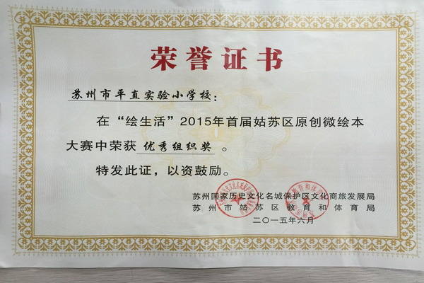 2015年1月,我市为了激发广大少年儿童的阅读热情、培养其阅读习惯,在全社会形成“多读书、读好书”的浓厚氛围和创新创造活力的局面,苏州国家历史文化名城保护区文化商旅发展局、姑苏区教育和体育局联合主办“绘生活”2015年首届姑苏区原创微绘本大赛。通过历时两个多月的构思、创作与修改后,2015年3月,我校完成了一批优秀“微绘本”作品,并在此次大赛中获得特等奖和一二三等奖的优异成绩。