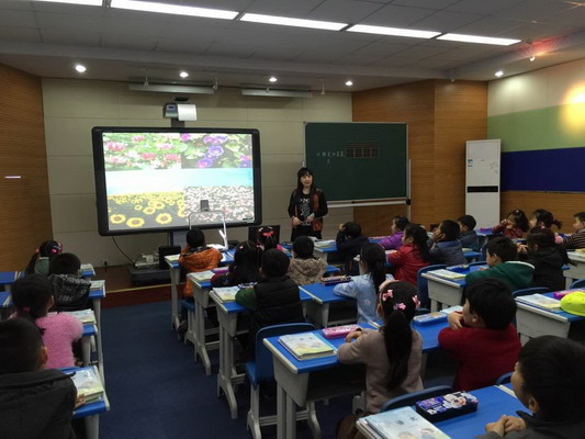 本次教研活动分两个环节。首先由我校吴军老师和姜芸老师分别上了语文研讨课。吴军老师执教的《鲜花和星星》,是一首儿童诗歌,老师不仅通过多媒体课件将孩子们带入了一个鲜花满地,繁星满天的世界,而且指导孩子们通过多种形式来朗读,再现了儿童看鲜花、数星星时的天真烂漫,充满了童趣。课上孩子们兴趣盎然。姜芸老师执教的《识字5》,是一篇采用“词串”形式的识字韵文。韵文围绕“夏天”这个主题,将12个词语按照一定的分类,分别介绍了夏天特有的天气、水果、动物、花儿。教师执教时配上精美的插图又为学生了解夏天特点创设了情境,让学生在识字识词中体验到趣味,使学生的识字识词和认识事物巧妙地结合起来,充满了生活气息和童趣。