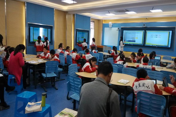 在接下来的学习交流中,姚园静、张程晓老师在录播教室,凌梅、徐桢老师在未来教室执教分别了语文、数学与信息技术整合的研讨课,展示了平直教师的学科与信息技术整合的能力,也请对方老师进行了点评与指导。学习组的黄海燕老师说,他们佛山市 “一师一优课”的活动也在进行中,这样深入的实践与交流促进了双方的共同发展,收获匪浅。团队中的几位数学、英语、科学学科的老师和平直相应的教研组就学科课题研究、课堂教学都进行了进一步的研讨与交流学习。这一周正逢学校第四届“百孝节”活动暨学校艺术节活动开幕,佛山市的8位名师团队在组长黄海燕老师的带领下全程参与,用手中的摄相机不断记录下一个个感人的瞬间,表示要把平直实小把传统文化融入到学生日常教育活动中的这种做法带回佛山,带回他们的校园。