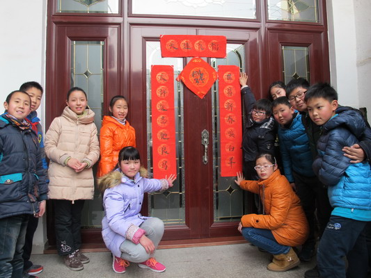 2月12日,小伙伴们带着这些精心撰写的对联,走进渡村,送给沈老师全家及周边的街坊邻里以最诚挚美好的祝愿。抹浆糊,贴春联时,大伙儿不禁想起了王安石的千古名句“千门万户曈曈日,总把新桃换旧符。”在老师的带领下,孩子们齐诵《元日》,小小的举动,在迎新之余不禁又增添了些许文化味儿。