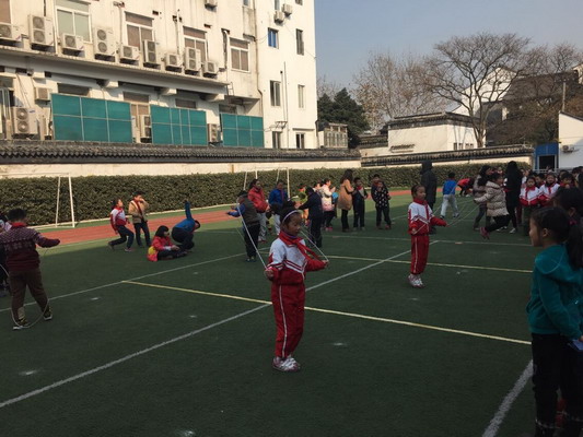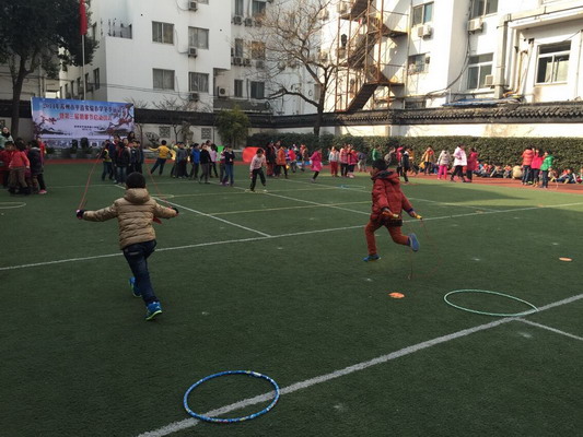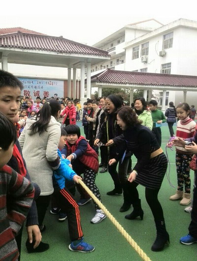 比赛项目除冬季三项的跳绳,踢毽,跳大绳三个项目外还增设了集体项目跳绳接力和拔河。参加比赛时,各班选手个个摩拳擦掌,精神振奋,都想展示出自己最高的竞技水平,为班级争光。随着比赛一声哨响,全场顿时热闹起来。选手们不愧是各班选拔出来的高手,个个都很厉害,精彩的场面让人目不暇接。在紧张激烈的踢毽、跳绳比赛结束之后,紧接着大家最关注的跳大绳比赛隆重登场,运动员们娴熟的动作,密切的配合,加上观众的鼓劲加油声,将全场气氛掀到了最高潮。而高年级的拔河项目,从报名就吸引了同学们极大的兴趣,比赛时每个班主任都在参与在旁边加油喊号,好像参加比赛的是他们自己一样,加油声、呐喊声此起彼伏,操场上顿时变成欢乐的海洋。