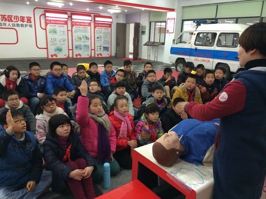 一走进少年宫的星光自护馆,队员们就观看了急救视频,了解遇到紧急情况时的施救措施。看完视频,指导老师用人体模型示范急救正确的方式,规范的手势,专业的讲解深深地吸引着队员们。看完示范,分成4个小队用人体模型进行实践演练,认真的眼神,专注的神情,指导老师也忍不住要和队员们一起演练。