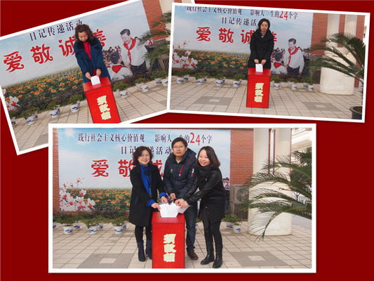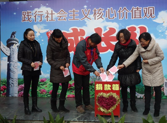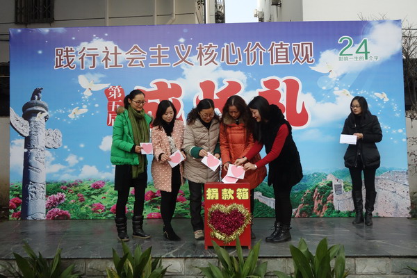 在辅导员老师的讲话中,捐款仪式拉开了帷幕。一开始就由徐校长和杨书记带领着我校领导班子团队自愿献上了他们的一份爱心。同时,自上周我校工会向全校老师发出“慈善一日捐”捐款倡议后,我校全体教师积极响应,纷纷献上自己的一份爱。并在今天,由各年级组长代表上台将老师们的全部捐款投入了捐款箱。