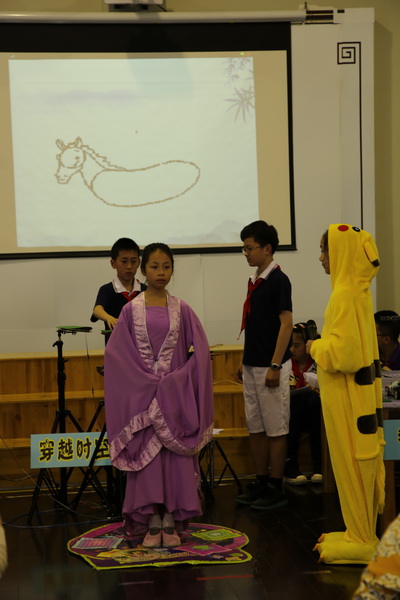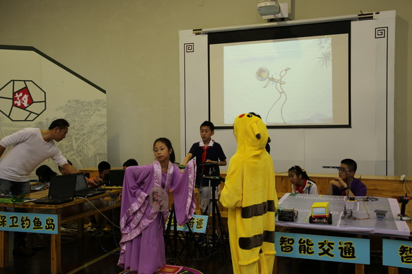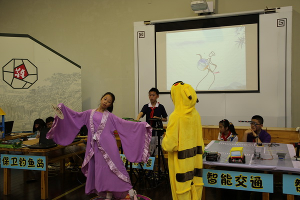 平直实验小学的scratch创新作品“穿越时空的奇迹”是学生利用Scratch编程软件与艺术相结合的项目,学生利用普通的三脚架、笛子和废旧的跳舞毯上加装了触动传感器、光度传感器等,使不起眼的材料变成了鲜活的架子鼓、笛子和跳舞毯。创新项目分为四个部分展开,其一.笛声悠悠,书声琅琅诵白词经典;其二.舞姿袅袅,风扇依依绘古韵今风;其三.鼓声阵阵,笔走墨飞展万马气象;其四.童心昭昭,书韵洒洒铭心平至直。伴随着阵阵鼓声电脑屏幕上随之绘画出一匹奔腾的骏马,在澎湃激昂地打击乐下顿时呈现出万马奔腾,其寓意着百年老校奔腾不息,执着不已的精神。笔走墨飞,学生用超声波传感器写出了心平至直的百年校训。