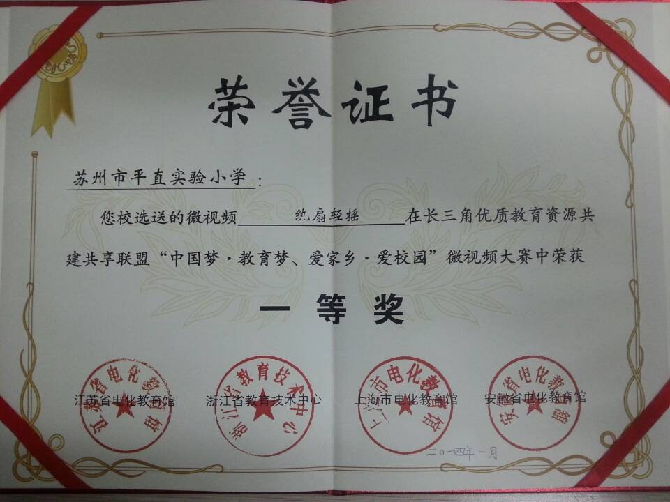 江苏省电教馆书记陈明在会上宣读了 “中国梦•教育梦、爱家乡•爱校园”微视频大赛获奖作品名单,并和与会领导为获得“中国梦•教育梦、爱家乡•爱校园”微视频大赛获奖选手和单位颁奖。苏州市平直实验小学选送的微视频作品《纨扇轻摇》从319件参赛作品中经过层层筛选和专家评比,最终获得一等奖。