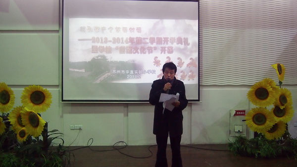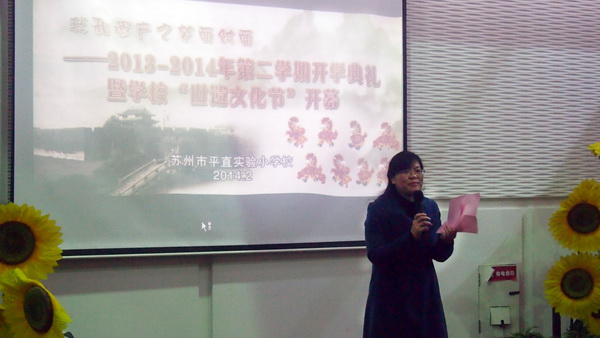 2014年2月17日,苏州市平直实验小学的全体师生齐聚一堂,举行2013—2014学年度第二学期开学典礼。本学期的开学典礼特别为孩子们打造了一道文化盛宴,即世遗文化节的开幕。学校特别选派小小导游分别从学校周边历史物质文化的采集和学校为弘扬传统打造的系列主题文化活动等方面对展板进行介绍,清晰的口齿、大方的仪态、精彩的讲演,赢得了前来参观代表的一致好评。精美的绢宫扇展和中秋香斗的再现,让大伙饱足了眼福,与此同时,学校还特别迎来了八骏为孩子与世遗之梦的面对面引路导途。参加开学典礼暨非遗文化节开幕的领导嘉宾有市人大原副秘书长,苏州市教育学会世界遗产教育专业委员会理事长董宙宙;苏州市教育局教科院副院长朱文学;联合国教科文组织亚太地区世界遗产培训与研究中心培训部主任王沁冉;苏州市教育学会副秘书长冯黎;苏州市教育学会世界遗产教育专业委员会副理事长钟连元。
