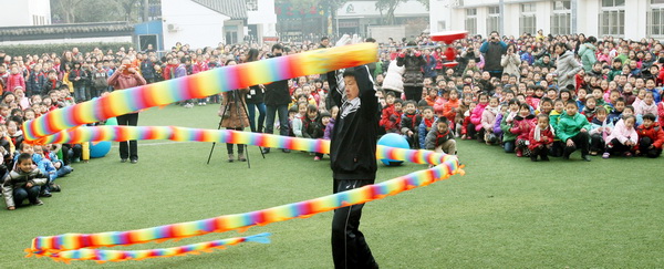 在启动仪式的现场,学校请到了由邱老师带领的空竹队,他们在司令台进行了精彩的表演,他们娴熟动作极具韵律美,空竹抖动的声音富有节奏感,师生们看得眼花缭乱、热血沸腾,孩子们的眼中充满了羡慕,他们跃跃欲试,恨不得立刻上台学一学呢!各班的学生代表走上台前向老爷爷、老奶奶们学习如何抖空竹,兴奋、喜悦的表情浮现在那一张张可爱的小脸上。