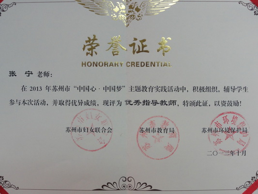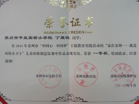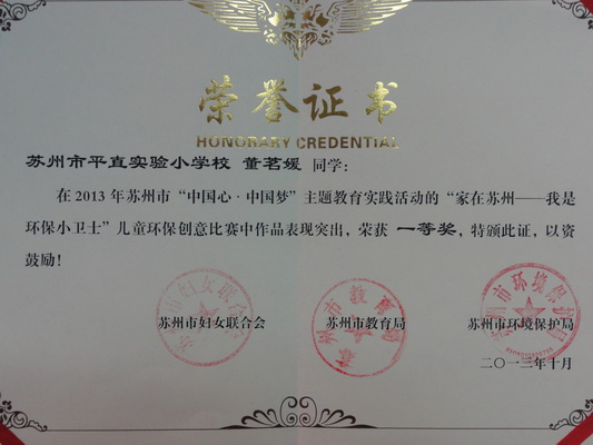 此次活动经现场比赛、主办单位评比,我校分别荣获“中国心·中国梦”主题教育实践活动优秀组织奖和“童心向党,歌声飞扬”歌咏比赛二等奖。刘薇、张宁、许智英、宋佳希四位老师在“中国心·中国梦”主题教育实践活动中,被评为优秀指导教师。六(2)班的董茗媛同学和六(6)班的丁康悦同学在“家在苏州——我是环保小卫士”儿童环保创意比赛中作品突出,荣获一等奖。