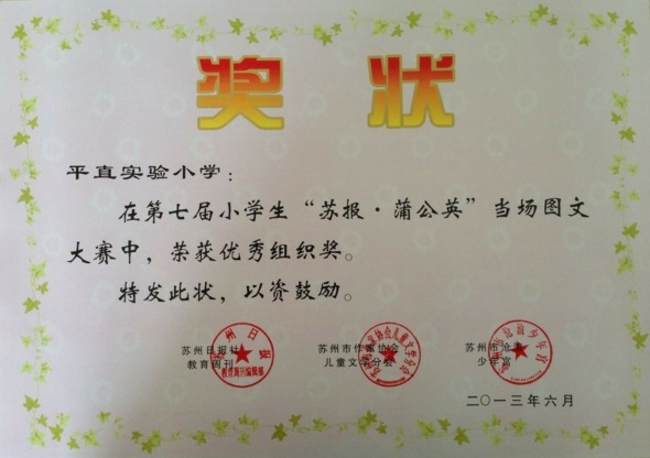 活动最后,“蒲公英作文大奖赛”优秀组织奖获奖单位上台领奖。平直实验小学的赵校长代表全体老师和参赛的孩子们微笑着上台接受表彰。一直以来,苏州市平直实验小学都积极参与各类竞赛,鼓励孩子们在竞赛中锻炼自我,提高自我,完善自我。学校《感悟生活:儿童生活日记教育的校本研究》课题亦旨在引导儿童从生活中感悟酸甜苦辣,抓住心中涌动的思考和感悟记录于纸、珍藏于心。这与“蒲公英作文大赛”的主旨在根本上有着异曲同工之妙。