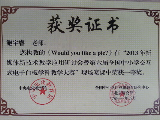 年新媒体新技术教学应用研讨会暨第六届全国中小学交互式电子白板学科教学大赛中分别获得一等奖和三等奖。