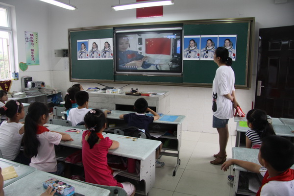 6月20日上午10时许,神舟十号的航天员在天宫一号这一“中国的最高讲台”开展太空环境下的科学实验,为全国青少年进行太空授课,平直实小也组织全校师生共同收看太空授课实况,以直观地认识失重环境下物体运动特性、液体表面张力特性等科学现象。