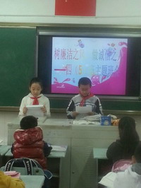 班队课,孩子们积极参与,充分准备,以各种形式诠释廉洁的意义,以身边人,身边事告诉大家,敬廉崇洁应从我做起。他们有的表演廉洁小品,有的朗诵廉洁歌谣,有的进行了激情洋溢的演讲,有的用歌声表达了自己的心声。每个班级都认真开展了廉洁班队,让廉洁真正走近了孩子,引导他们感受廉洁的真谛。
