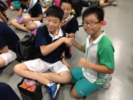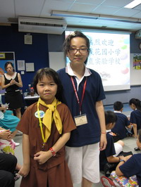 第一天我们和新加坡小朋友都早早地来到礼堂,焦急地等待着和新加坡小伙伴结对。“欣悦和咏芳!”我激动地走出队伍,和叫吴咏芳的新加坡同学一齐走出了队伍,我们还相互交换了礼物,我送给她一副我写的书法《宋人游吴》,而咏芳送了我一些她亲手制作的中英文小卡片,看得出来她非常有心。跟她聊过几句之后我便知道她和我一样很期待这次的交流活动,很向往去中国旅游。
