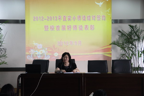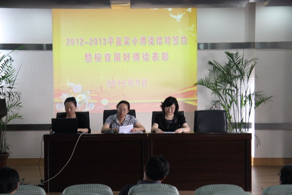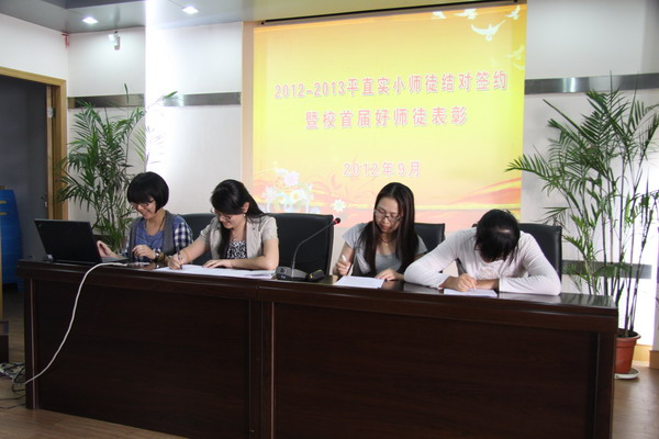 2012年9月19日,苏州市平直实验小学在校报告厅举行了隆重的师徒结对签约仪式。活动由学校副校长赵康主持,赵校长强调学校的发展需要一流的师资队伍,这是每一所学校重中之重的工作,而青蓝工程师徒结对正是我校建设师资队伍的一项重要举措,一直以来,学校已将此项工作形成了制度化、规范化。