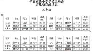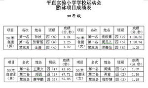 6月13-14日我校运动会隆重举行。比赛项目按年级设定。一、六年级为田径比赛,项目有30米、立定跳远、50米接力跑 、垒球。二~四年级为游泳比赛,项目有闷水PK赛、25米自由泳打腿、50米自由泳打腿、25米自由泳、50米自由泳。各班学生都踊跃报名积极参加各项比赛。比赛当天,学生都来为各自班级的参赛选手呐喊助威,场面十分热烈。裁判由体育教研组的老师担任,比赛秩序井井有条。特别是游泳比赛,在体育馆游泳中心展开激烈角逐,上演了一场精彩的水中竞技秀。在泳道中,选手们个个如鱼似箭般在水中穿梭,展现出选手们矫捷的身姿和精湛的技术。展示出平小的游泳健儿们不畏风浪,勇于进取的体育精神。看泳池里,比赛激烈;泳池边,拉拉队助威声一浪高过一浪。通过本次游泳比赛,旨在让学生热爱游泳运动,爱上游泳课,积极参加游泳锻炼,掌握一定的游泳技能,拥有健康的体魄,具有一定的安全、自我保护意识。养成良好的心理品质,形成健康的生活方式。