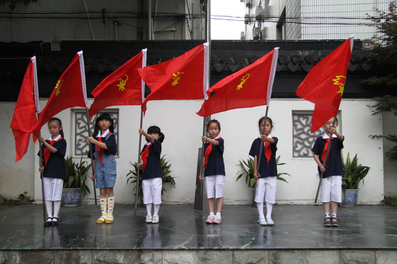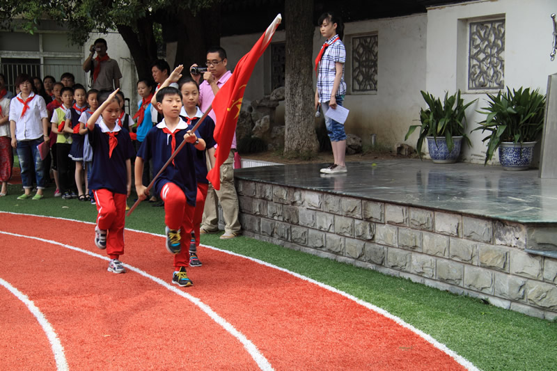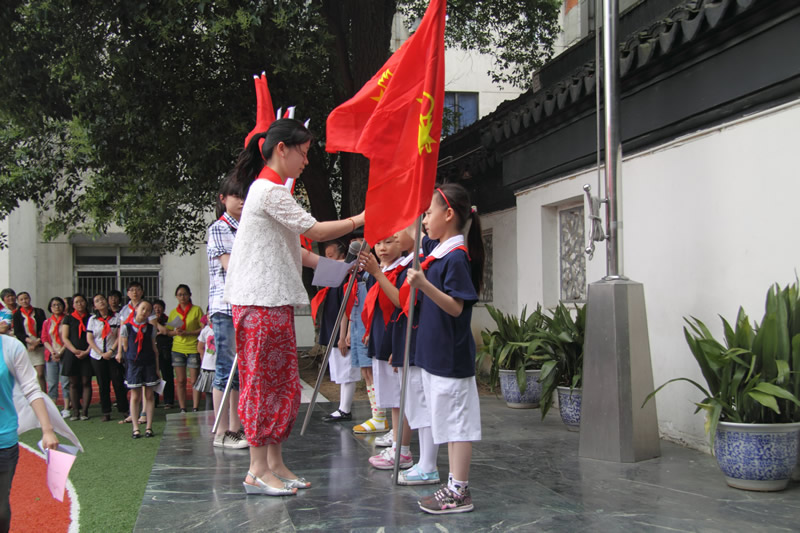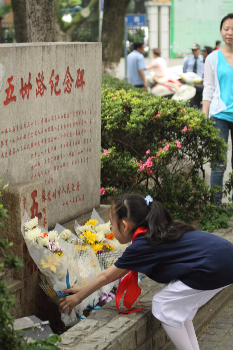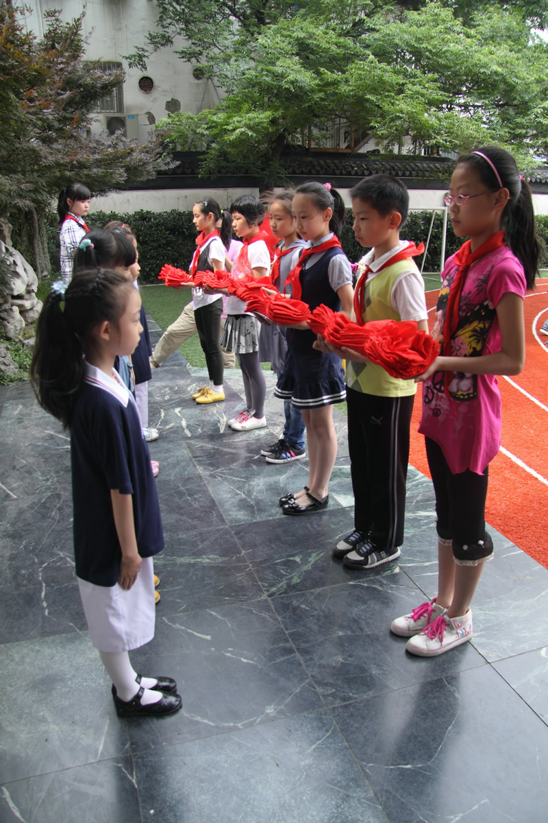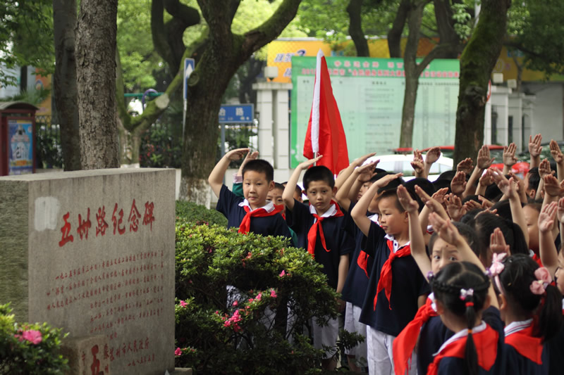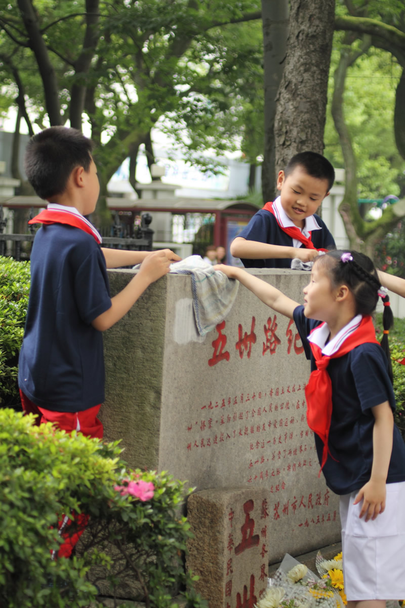 红领巾胸前飘扬,同学们看着它,听着那扣人心弦少年先锋队队歌。全校队员跟着校团支部书记一起呼号:准备着,为共产主义事业而奋斗。时刻准备着!结束了这次入队仪式,孩子们在校领导及中队辅导员的带领下踏上了新的征程,他们首先参观了苏州大公园前的五卅纪念碑,以回望过去、不忘历史、缅怀先烈,在纪念碑前,队员们郑重宣誓:“为中华之崛起而读书”。