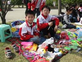 图书、碟片、玩具、零食……在一个个小摊位上,待售货品琳琅满目,除了小部分是尚未拆封的,大多数货品是“小老板”们自己的旧物,更有孩子们的书画手工作品。