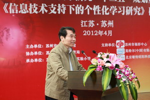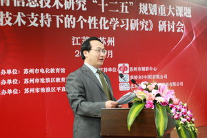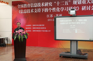 江苏省电化教育馆尤学贵馆长发表重要讲话,对参与本次研讨会的各位领导、专家和来宾表示衷心的感谢。充分肯定了苏州沧浪区在信息技术支持下的教育改革,并希望苏州市平直实验小学在“十二五”规划课题《信息技术支持下的个性化学习研究》的指引下,走在教育信息技术研究的前列!