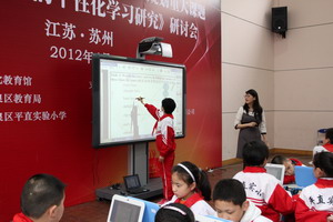 在本次活动中,全国“十二五”规划重大课题《信息技术支持下的个性化学习研究》专家组成员朱晓芳副校长和苏州市平直实验小学青年教师吴婕老师分别执教了两节新形式下1对1个性化学习研讨课。江苏省电化教育馆办公室徐晓梅主任进行了现场点评,充分肯定了创设移动学习环境,并借助教学平台对学生开展1对1个性化学习研究的重要作用,积极探索在新形势下数字化多媒体教与学的有效方式,来促进教学理念和学习方式的革新,实现信息技术在教学中的深度应用。