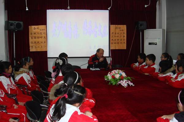 来教授学生们唱唐诗的是一位已经年过七旬的老人——王敬义老先生,他从二十年前开始学唱唐诗,至今已能用唱的形式将60首唐诗,用3、4种不同的曲调予以吟唱。在教唱唐诗之前,王老先生先为学生们讲述了诗的产生以及唐诗的不同形式和内容。而后以孟浩然的《春晓》和王维的《杂诗》两首唐诗为例,用两种不同的曲调,一句一句带领学生进行吟唱。虽然没有乐器的伴奏,但曲调本身的抑扬顿挫和婉转优美,依然带给在场跟学的同学们不小的惊喜。同学们很快能跟着一句句唱,和谐的童声更加衬托出了诗的音乐美。王老先生又以合唱、分组唱、个人唱的形式帮助孩子们一遍遍温习。孩子们出色的表现让老人感叹中华文化的传承后继有人,自己倍感高兴和欣慰。参加此次活动的学生也非常庆幸能有这次机会接触到唱唐诗这种形式。原来诵读唐诗也可以是一种乐趣,一种享受,自己对唐诗乃至中华古文化有了更浓厚的兴趣。