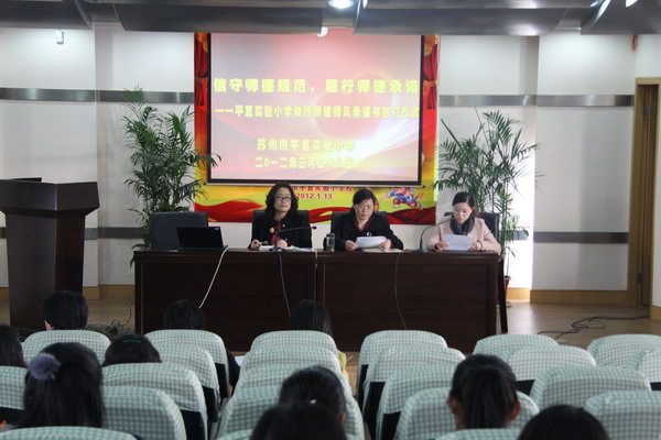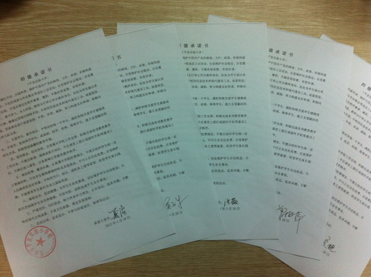 为更好地履行教师职业道德规范,塑造良好的教师形象,做一名受学生尊敬、让家长满意、获社会好评的人民教师,2012年3月28日下午,平直实验小学举行了师德承诺书签订仪式。
