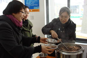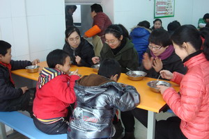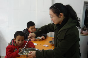 在培智的食堂,志愿者老师们亲手为这里的孩子分粥、喂粥,比平时更多了一份爱心和细心。志愿者们都希望培智的孩子们也能像平直的孩子一样在新年来临之际,吃着甜甜的腊八粥,体会年的味道。同这群特殊的孩子们一起吃粥,看着孩子们露出天真灿烂的笑容,听着他们有礼貌的声声道谢声,老师们颇感欣慰和感动。