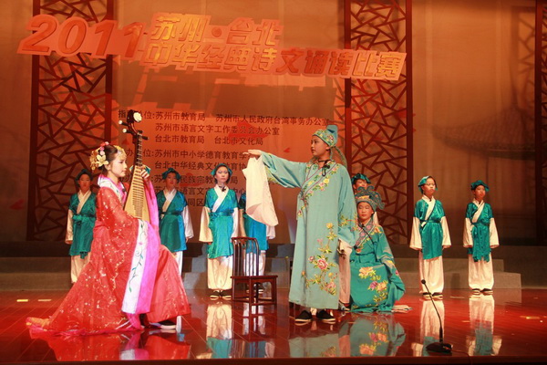 来自两岸的十四所学校的百余名师生参与了此次诗文诵读比赛活动,师生们或快板说唱,或舞跃吟诵,或情境演绎,以多样的形式,为来自两岸的观众评委们献上了一台台精彩的表演。来自沧浪区的苏州市平直实验小学以一曲经典的《琵琶行》摘得了本次文化交流诵读比赛的金奖。