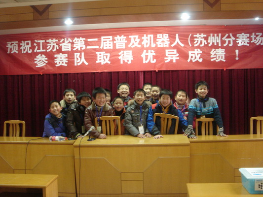 本次比赛于201119在苏州新区一中举行,作为苏州分赛场,吸引了近20支参赛队参加竞赛。我校的15名学生经历了机器人编程和机器人走轨迹两项比赛。他们和竞争对手在同一平台上竞赛,这次比赛检验了他们对机器人基本技术的理解和掌握程度,调动了他们对于机器人学科的热情,激发了他们对机器人技术的兴趣,同时更锻炼了他们的动手实践能力,每一个参赛学生都受益匪浅。