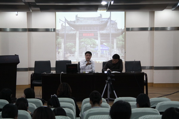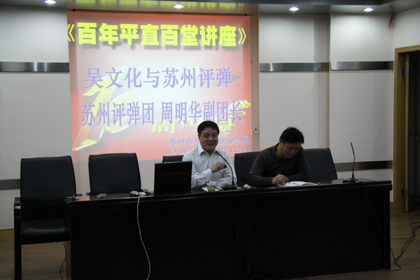 2010 1013 下午3点半,苏州市评弹团副团长、苏州市曲艺家协会副主席、国家二级演员周明华副团长来我校作“苏州评弹与吴文化”的讲座。一个小时的讲座非常生动、精彩,吴侬软语的魅力被周团长表现得淋漓尽致。通过周团长的介绍,我校教师了解到了一些苏州的历史传说,他通过生动的故事讲述了吴国建立的历史,讲述了泰伯让贤、伍子胥奔吴、专诸刺王僚等典故,穿插其中的“小包袱”常常让听讲的教师们开怀而笑,体会到了吴文化的精髓。整个会场笑语不断,掌声连连。这次活动,使我校教师更加了解了苏州的历史,特别是周团长提到的我校地理位置正是当年吴国子城所在地,更是让老师们对我校深厚的历史底蕴与有荣焉,活动结束后,老师们纷纷表示意犹未尽,并热情邀请周团长再来我校开设讲座。