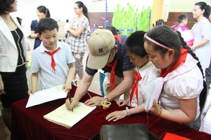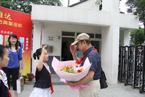 教授接过了少先队员的鲜花,并为他带上了红领巾。学生们的热情洋溢,校园暖暖的温馨情意,让