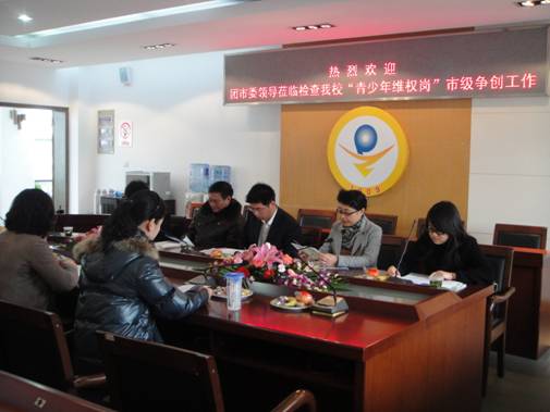 4月14日上午,平直实验小学迎来了苏州市“青少年维权岗”创建领导小组的检查。检查小组成员包括了团市委、团区委、公检法及国家级“青少年维权岗”单位主要负责人,对学校市级“青少年维权岗”创建工作进行检查验收。学校团支部书记毛蓉芳老师代表学校作了工作汇报。