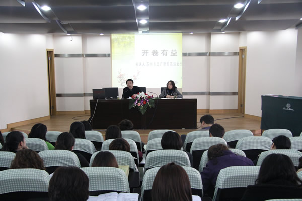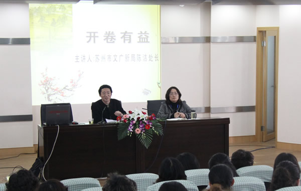 平直实验小学长期以来一直大力落实优质教育,积极拓展校外优质资源。为了深入开展校园文化建设,积极倡导校园读书活动,努力营造书香校园,4月21日下午,学校特邀苏州市广电新局陈洁处长为全体老师做了主题为“开卷有益”的精彩讲座。