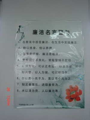 廉洁是一把剑,插向社会中的不良之风,将内心的澄净还给少不经事的孩子;廉洁是一阵风,吹走灰暗的阴霾,让生活的晴空重现蓝天;廉洁是一池水,洗涤诱惑的杂念,让淡泊名利的坦然浮出水面;廉洁是一首歌,唱响正气的旋律,让平直的老师拥有战胜诱惑、淡泊名利;廉洁是一亩田,播种新的希望,让平直的孩子明辨是非、道德高尚!