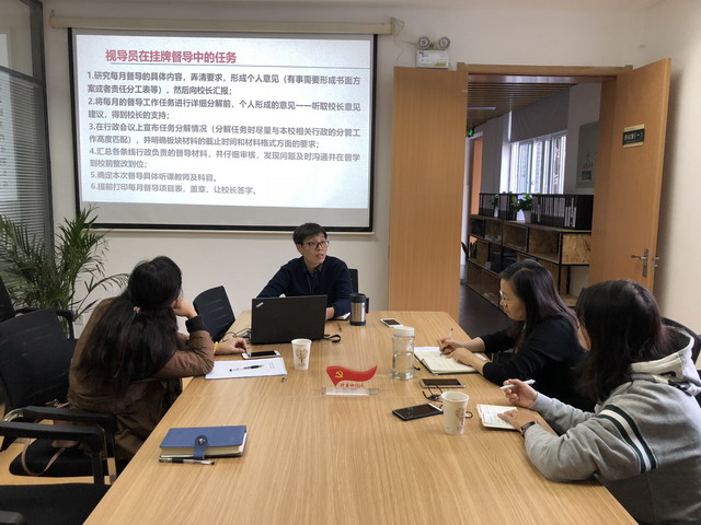 会上,季督学对视导员在挂牌督导中的任务予以了专题解说,要求视导员认真做好与责任督学的对接工作,认真研究每月督导的具体内容,弄清要求,形成个人意见后,汇报给校长,并听取校长的意见建议,得到校长的支持;在行政会议上宣布任务分解情况,明确板块材料的截止时间和材料格式方面的要求;汇总各条线行政负责的督导材料,并仔细审核,发现问题及时沟通并在督学到校前整改到位。督导当天,要求视导员全程参与整个督导过程:引领实地督查、组织师生问卷或访谈、材料查阅、听课等;在督导过程的各个环节拍摄照片,结束后精选相关照片,并认真撰写督导新闻报道材料,及时上传校园网 “挂牌督导工作”专栏;认真撰写本次视导员记录,汇总整理本次督导产生的相关材料,并及时打包发给兼职督学。